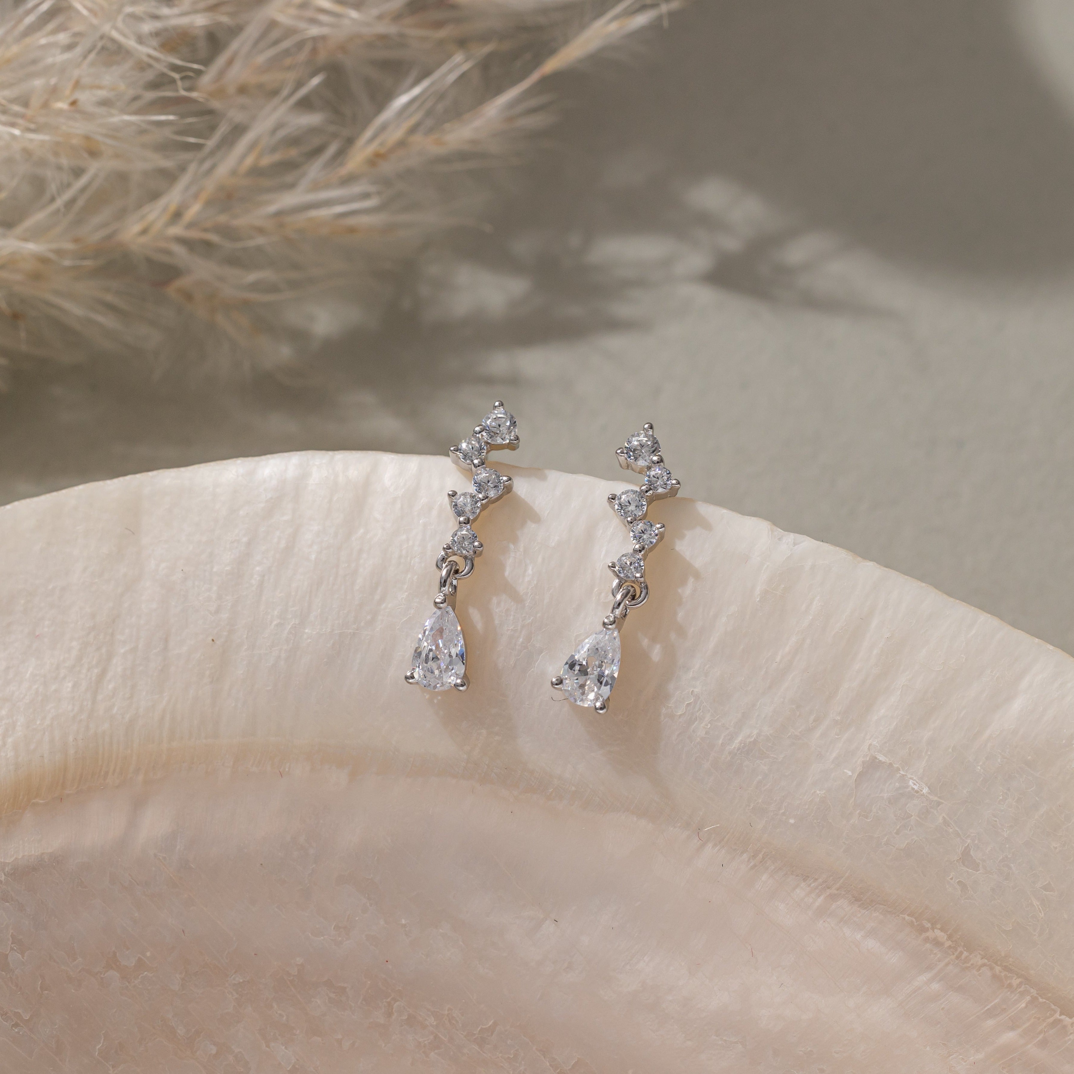 • These high-quality 925 Sterling silver and Cubic Zirconia diamond earrings add an elegant touch to any outfit. The minimalist design featuring a pear-cut CZ and tiny pave clusters stunningly hangs from a droplet dangle. Perfect for any occasion, these earrings make a great gift for her.