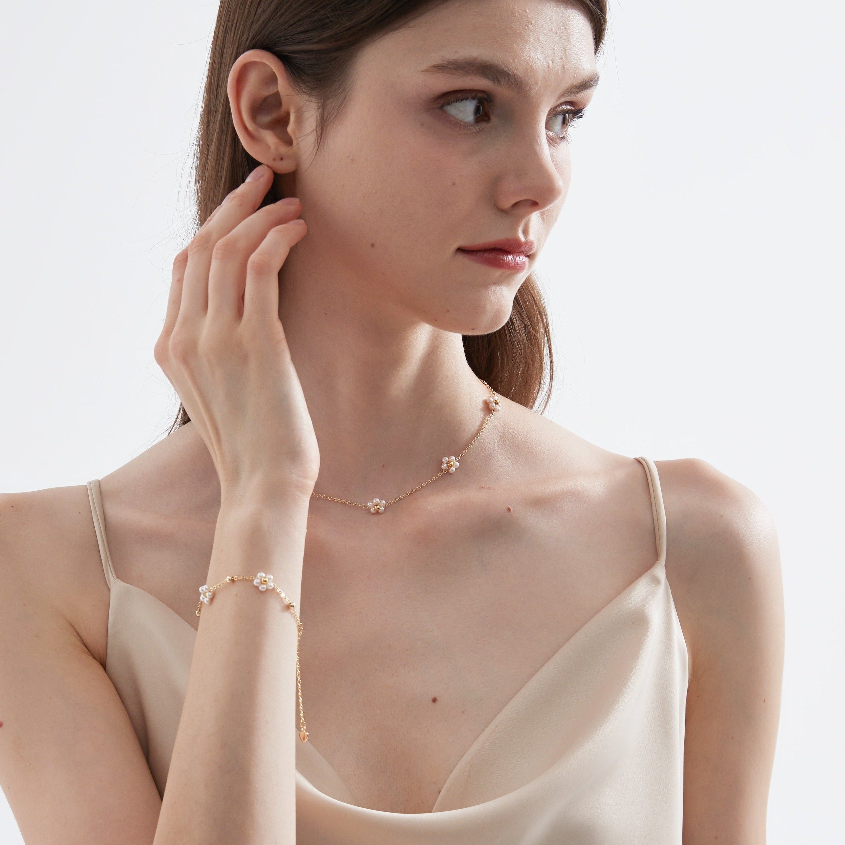 • This Beaded Pearl Daisy Flower Charm Bracelet is crafted with high-quality metal and finished with a luxurious gold plating. Perfect for a bridal, bridesmaid or wedding look, this delicate bracelet features tiny pearls and a beautiful daisy flower charm. Complementary earring and necklace options available.