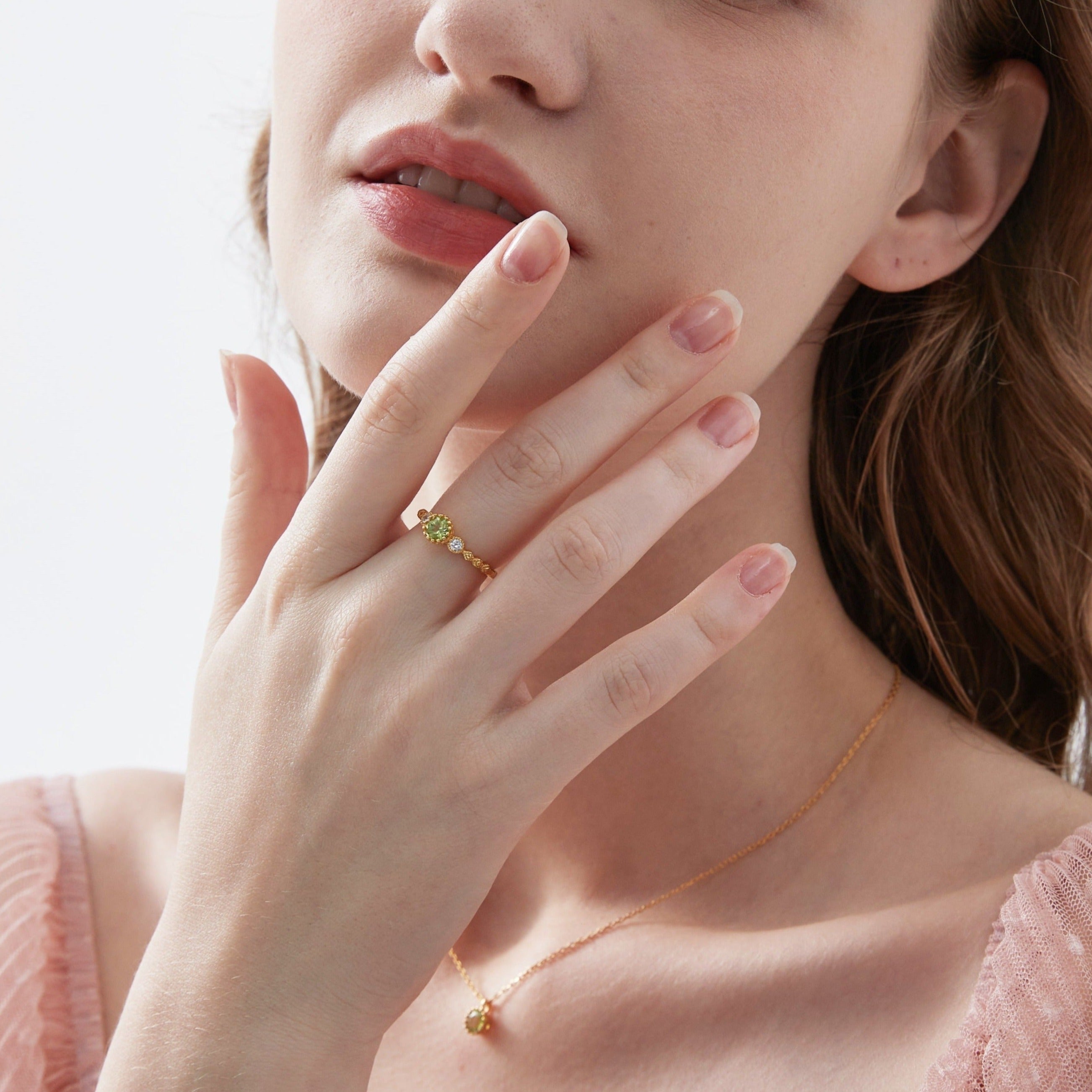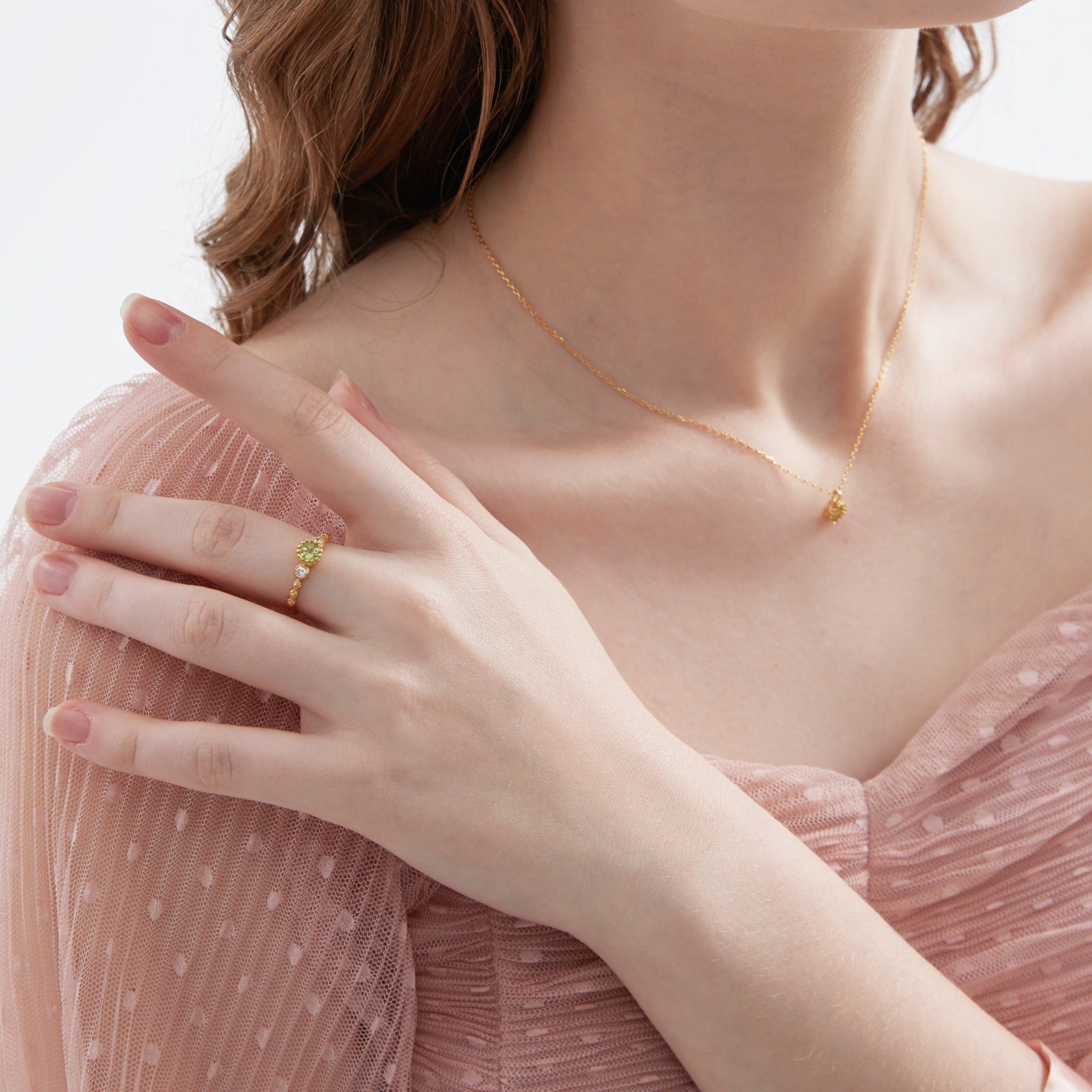 • This Natural Green Peridot Ring features a stunning 18K Gold Vermeil vintage design, and is adjustable to fit perfectly. It is made with 925 Sterling Silver and includes a birthstone to commemorate an engagement or anniversary. Available with simulated diamonds for added glimmer, this necklace is the perfect gift for her.