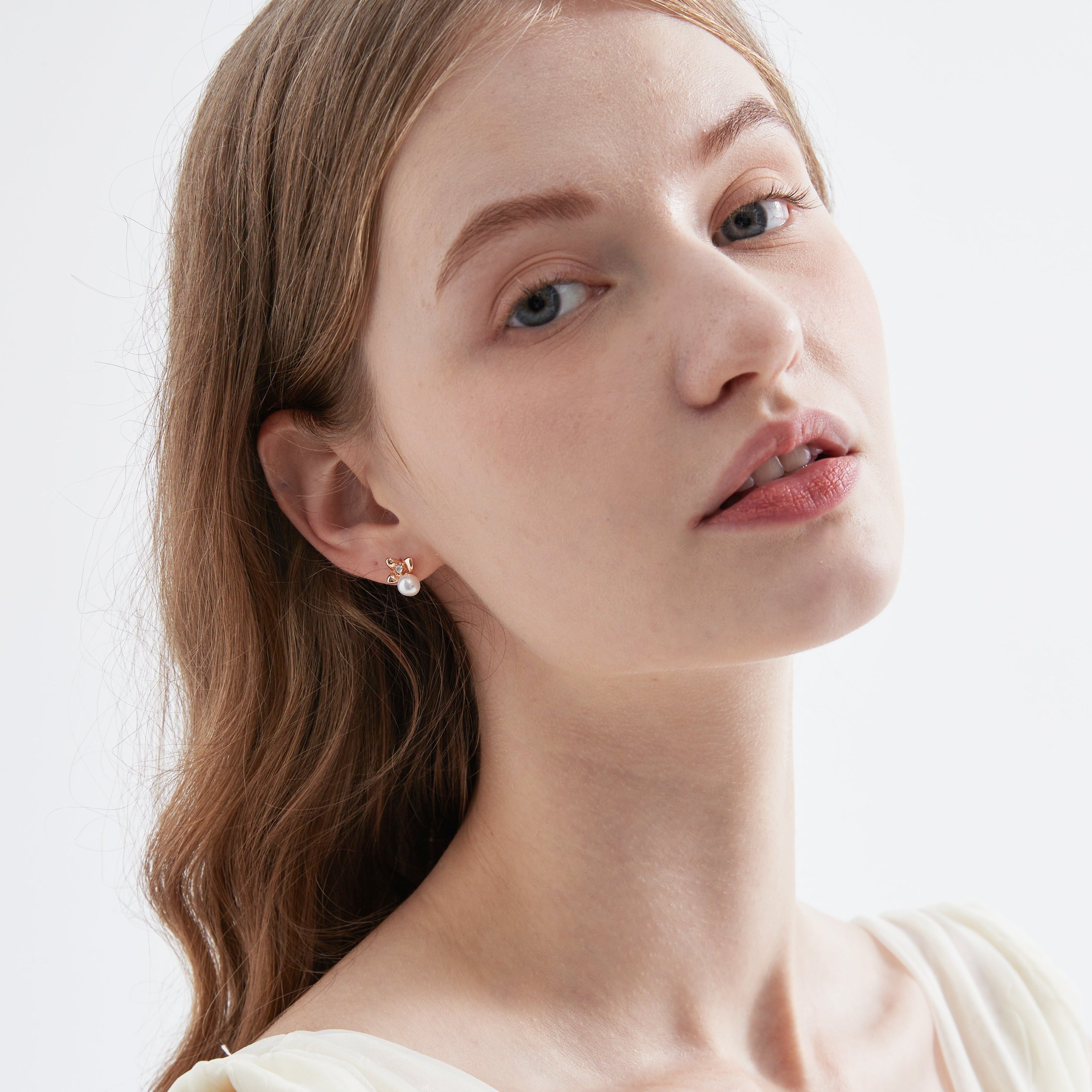 • These earrings have an elegant minimalistic geometric design. Crafted from 925 Silver and plated with Champagne Gold, they feature Natural Pearl and CZ Iris Flower Studs, as well as Tiny Dainty Plant Flower Studs for a chic look.