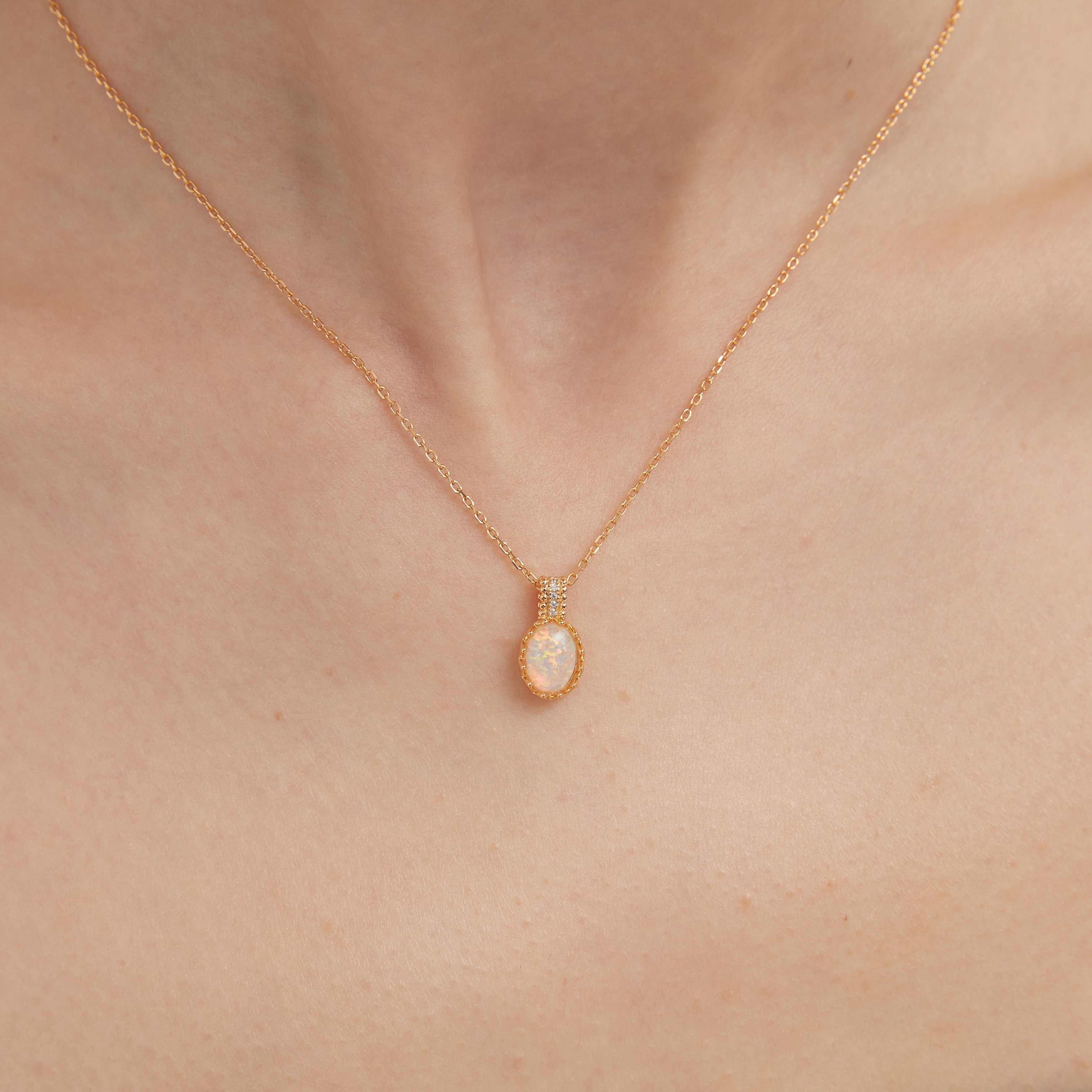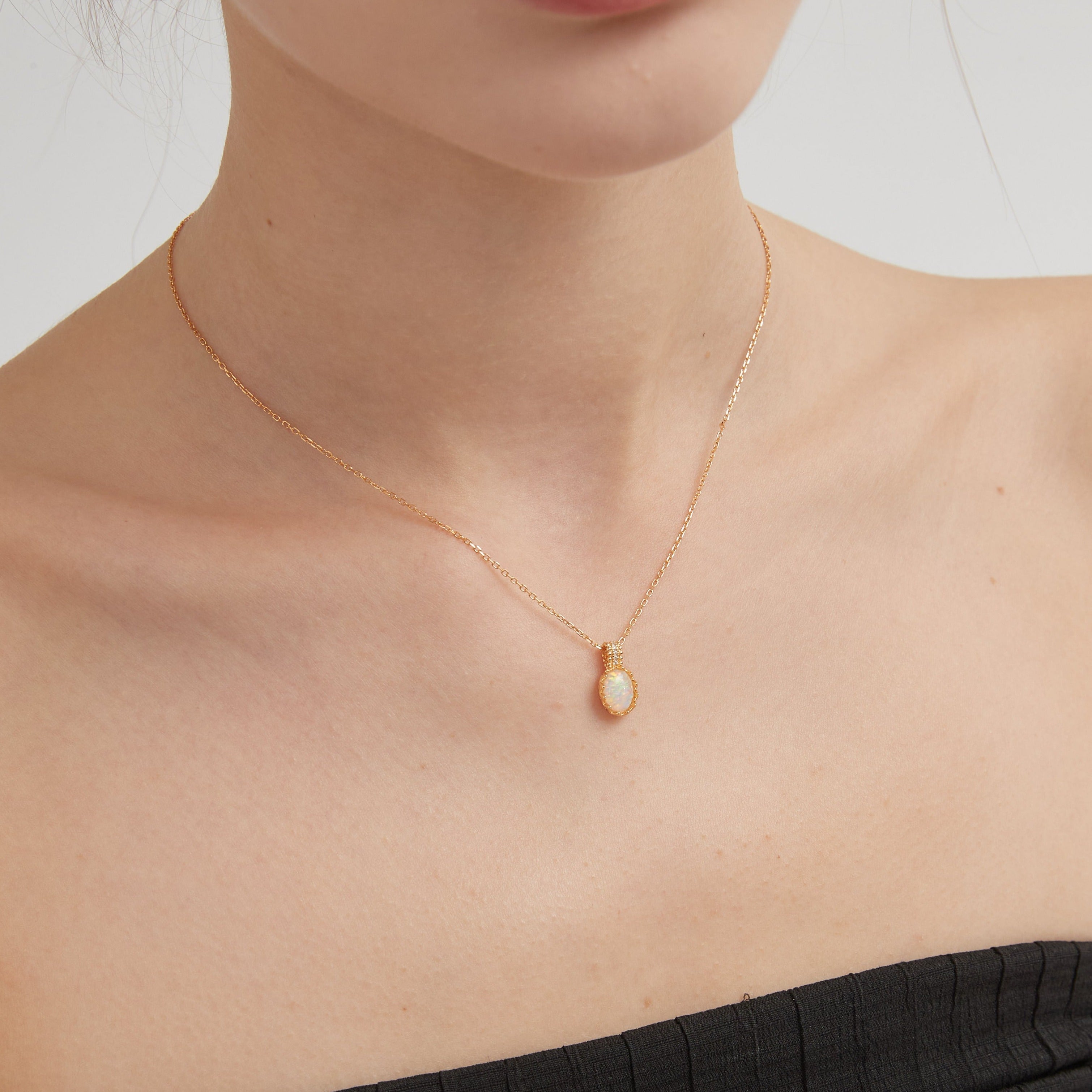 • This gorgeous Vintage Style Opal Necklace is made with 18K gold plated 925 sterling silver for a luxurious sheen. It features a luxurious lace design and is adjustable for the perfect fit. A beautiful addition to your jewelry collection, the opal stone signifies love and luck.