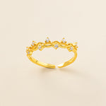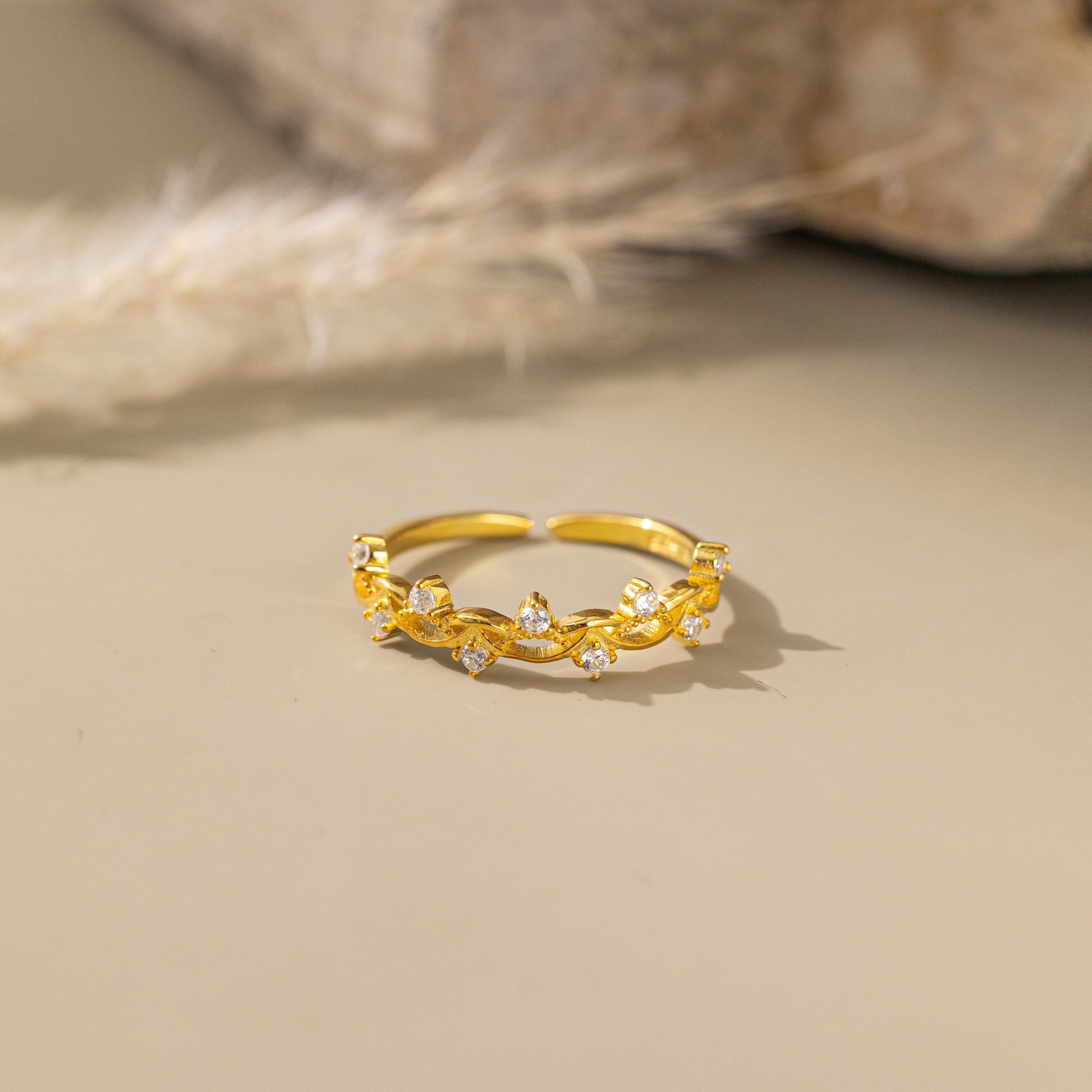 • This gold plated sterling silver adjustable ring features a delicate CZ-adorned wreath, making it the perfect modern and minimalist accessory. The tiny lace pattern is sure to make this ring a timeless addition to any jewelry collection.